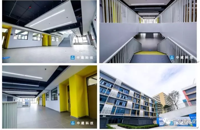 坪山区实验、锦龙、竹坑三所装配式学校项目由中建科技以EPC工程总承包模式承建,合同工期9个半月,精装交房,是全国首个采用装配式钢和混凝土组合结构建筑体系的学校项目,也是坪山区积极推进学校建设标准化的重点示范项目。该项目于2019年4月被列入“国家十三五重点研发计划项目示范工程”。为高质量、快速度完成项目建设,中建科技结合国家“十三五”重点研发计划项目——工业化建筑设计关键技术的创新成果,采用装配式钢和混凝土组合结构建筑体系,创新节点连接形式,实现86.5%装配率,达到国家装配式建筑3A等级标准。